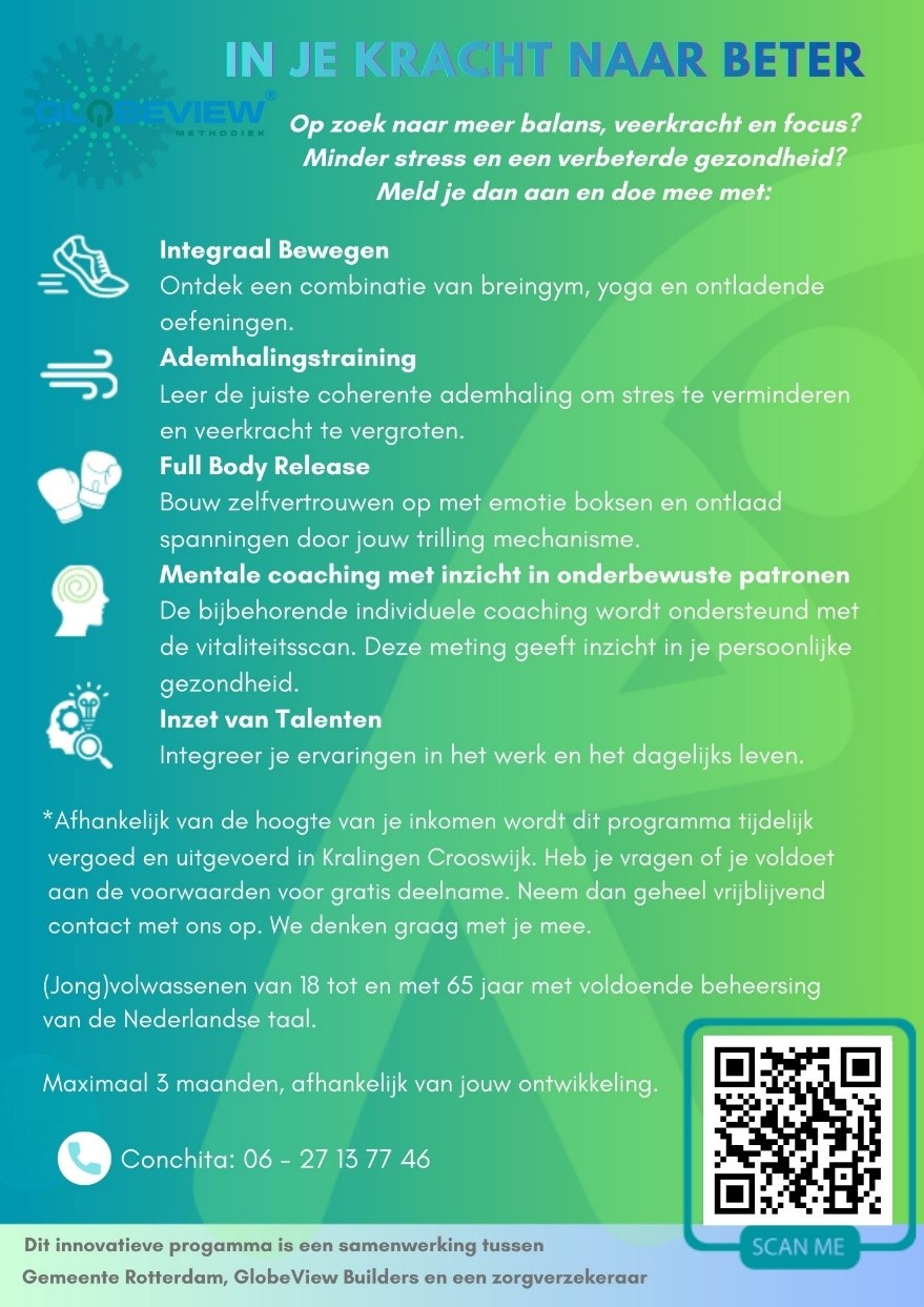 Voor (jong)volwassenen van 18 tot en met 65 jaar met voldoende beheersing van de Nederlandse taal. Afhankelijk van de hoogte van je inkomen wordt dit programma tijdelijk vergoed en uitgevoerd in Kralingen Crooswijk in Rotterdam.